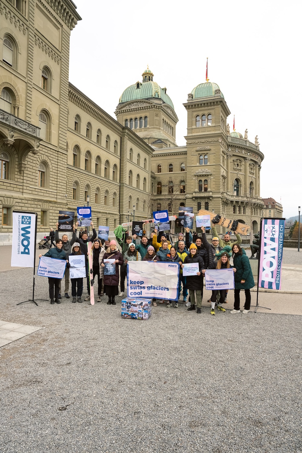 Im Sinne von POW trafen wir uns vor dem Sitz des Bundesamts für Umwelt (BAFU) in Ittigen zu einem Community Run in Richtung Bundeshaus. Die Unterschriften wurden anschliessend in einer grossen Kartonschachtel überreicht, die mit Gletscherfotos aus der Outdoor-Community geschmückt war. Die Bilder wurden gesammelt während des Sommers im Rahmen der Gletscher-Challenge. Der Anlass klang schliesslich bei einem gemütlichen Apéro in der Lumis Bar aus.